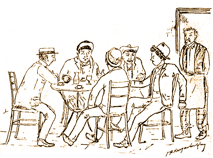 Σχεδιάζοντας στα τραπέζια του καφενείου Ζαχαράτου το μεταρρυθμιστικό σχέδιον της πόλεως των Αθηνών του Άγγλου αρχιτέκτονα Μώσον.